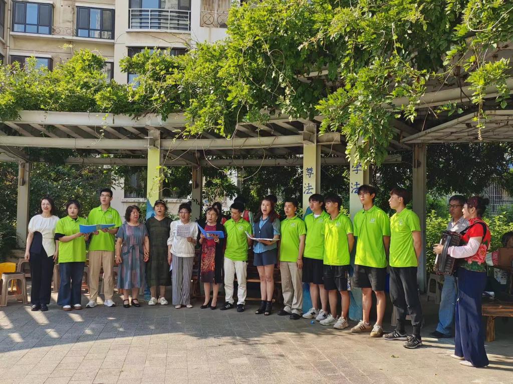 活动开始前期,要表演节目的同学利用业余时间进行了的紧张排练,精心准备了歌曲、舞蹈、乐器演奏等丰富多彩的节目。我们的带队老师杨钟悦和李晓朋提前与社区居委会取得联系,确定活动时间、地点,并得到了社区的大力支持和配合。活动当天,我们为活动的顺利开展做好充分准备。活动照片由韩文慧,王楚函两位同学记录。活动开始前,社区老年合唱团和舞蹈队陆续来到现场,与我们一起在社区练习室进行了彩排。我们配合的差不多了之后“校社共建文化社区,火红七月歌声飞扬”音乐汇演在社区内的法制宣传凉亭开展。首先,张洲通同学独唱表演的《当你的秀发拂过我的钢枪》闫晨旭、申叶凡两位同学进行了舞蹈表演,社区舞蹈队的奶奶们对他们提出表扬,邢浩、 张文慧两位同学与社区里的老人一起用二胡合奏了《豫北叙事曲》,社区老年二胡队很喜欢他们,对他们连连夸赞。还有吹笛子的同学与社区老人一起合奏的《红高粱变奏曲》,最后由仪德为、杨亚泽、张洲通同学与社区合唱团用动听的歌声一起合唱了《我不想说再见》,我们一起用动听的音乐和优美的舞姿,为青馨家园社区带来了一场视听盛宴。其他没有节目的老人们时而跟着音乐节奏轻轻拍手,时而露出开心的笑容,现场气氛热烈而温馨。
