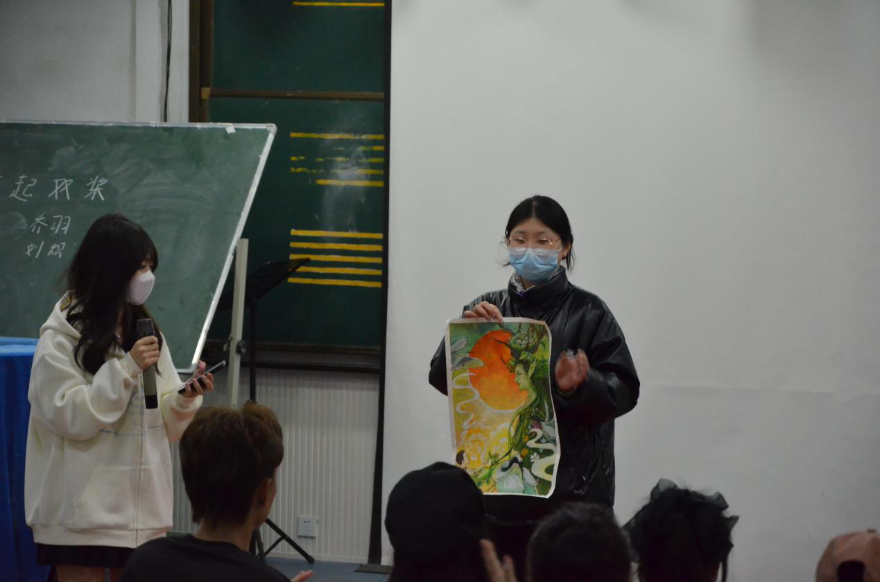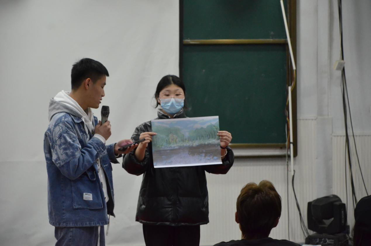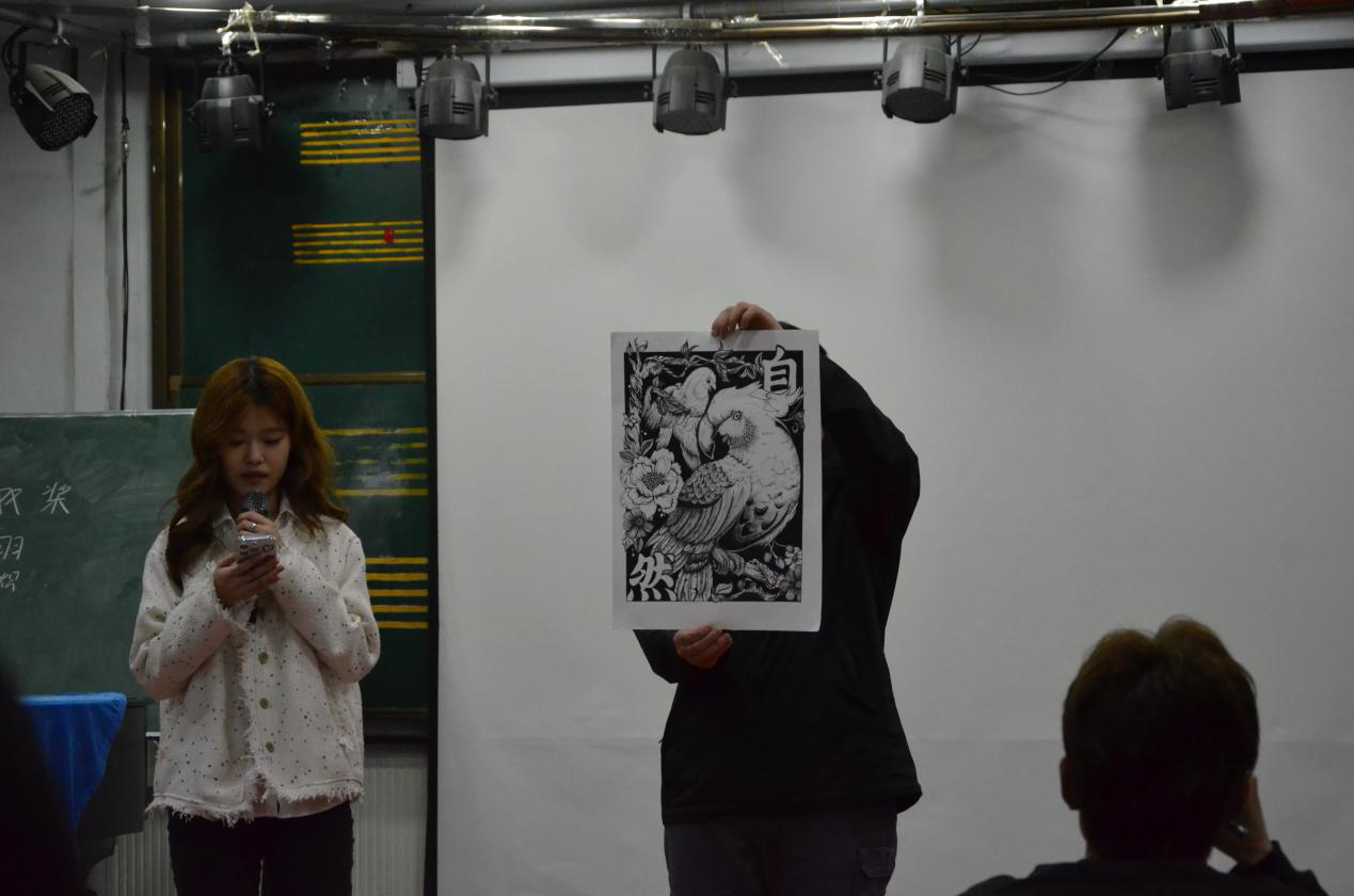 比赛共收到20余名同学的作品,经评选对优秀作品进行了现场展示与讲解。一等奖获得者张心怡同学展示的作品为《玄鸟》,通过描画玄凤鹦鹉的形象,来表达对自然的敬畏,对生命的尊重,生动形象地展示了当代青年对大自然的美好希冀;二等奖获得者何嘉慧、朱周睿,两人分别以“保护鸟类”、“走出非洲”为主题,展示了当代青年对于环境问题的思考;三等奖获得者是段宇希、王名岳、张嘉,三人运用线条色彩等形式,从不同角度展现了爱护自然,人与自然和谐共生的理念。