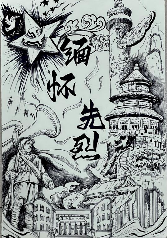 同学们踊跃参与,纷纷用创作和创意展示了自己对于英雄先烈的敬仰和深切缅怀之情,共计收到30余份作品,部分同学采取手绘的方式,用精细的笔触描绘英雄烈士的形象,展示先烈们灼热的信仰信念、炽烈的家国情怀;部分同学制作了主题海报,用线条和色彩展示缅怀与崇敬之情;部分同学撰写了书法字帖,录制了宣讲视频,通过各种文化作品表达对革命先辈的祭奠和怀念。