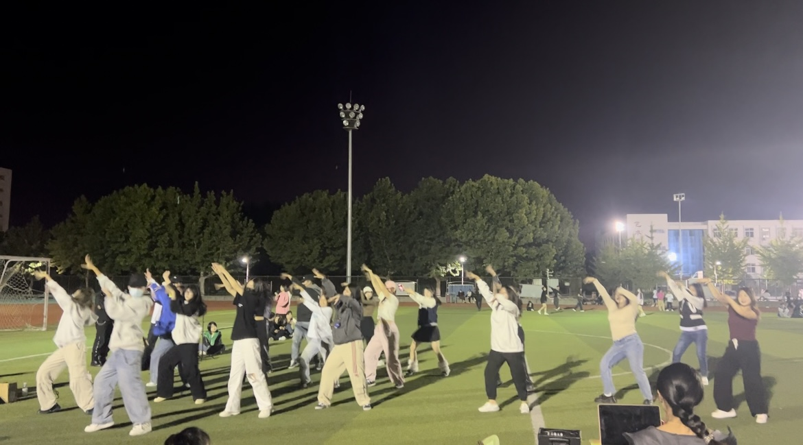 活动开场,首先由D舞社的成员们展示了《Resonance》《Crazy》等几支成品舞作品,成员们的热情点燃了全场的气氛,也向大家展示了D舞社的魅力。接下来社团负责人播放动感音乐,带领同学们随乐舞蹈,舞者们灵活曼妙的身姿,在灯光照耀下格外轻快利落,散发青春的朝气,展示着运动的美丽,体验着舞蹈的欢乐。欢快动感的氛围吸引了不少在操场上活动的同学驻足观看,部分同学自发加入到舞蹈中来,跟随领舞者一起欢乐舞动。
