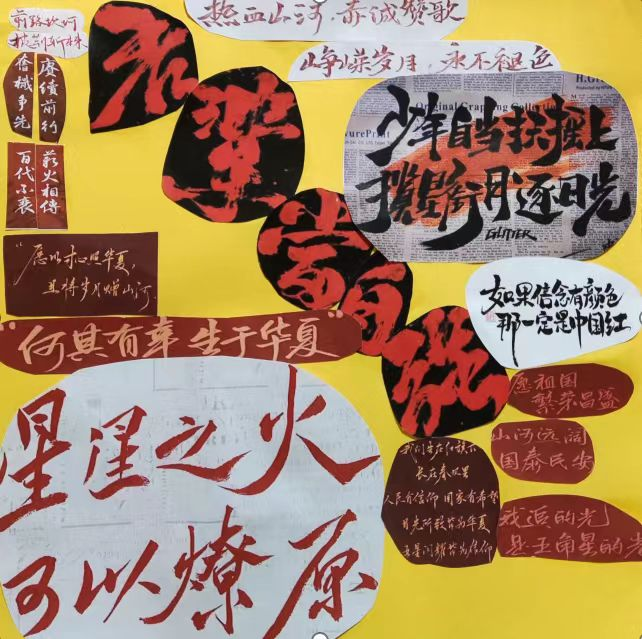活动共收到作品30余份,同学们通过将报刊、图册上面的文字、图画拼贴再组合的形式,运用天马行空的想象,融入对于青春的感悟,创作出自己的诗篇。在作品中,同学们展示了对于青春的思考,对于革命先辈的敬仰,和对五四精神继承,展现了青春跃动的文字之美和强烈的视觉冲击力。作品于2024年5月30日在艺术楼305教室进行了现场展示,引发了同学们的共鸣,让青年感悟家国情怀,传承革命精神,感受自己的青春年华。